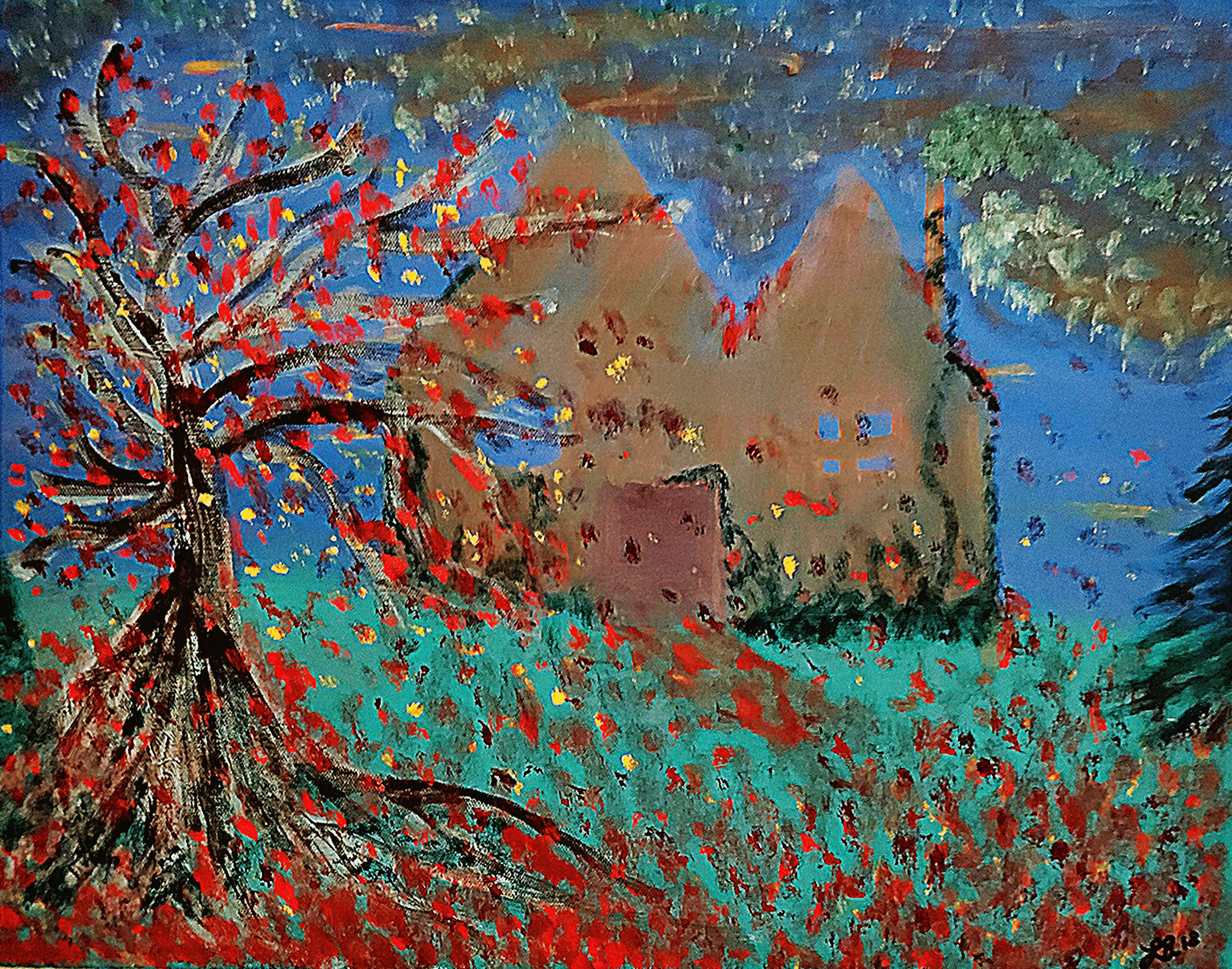This is a product of using an unfinished painting and turning it into something different.  At first I did not like it. Then after letting sit in the corner for a few weeks I went back to it and decided it was very spooky and had a touch of fantasy that gave it some mystery.   Good for a Fall or Halloween decor.