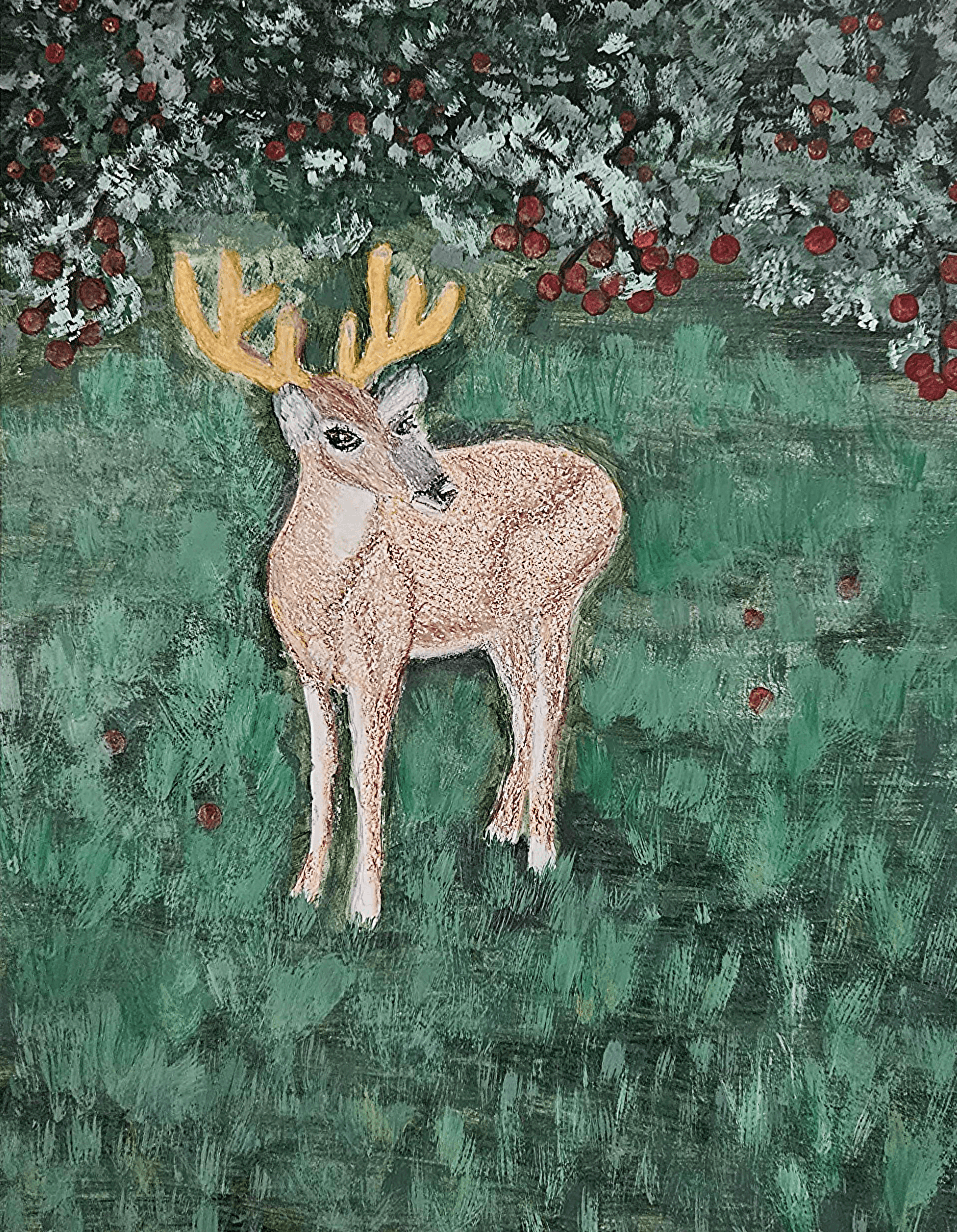 This is non enhanced digital image of the original mixed media pastel and acrylic painting.  This painting was completed a couple of years ago. It was inspired by all the deer in my yard and early fall.